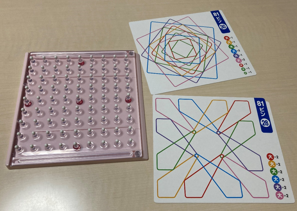 輪ゴムを使ってボード上に図形を作る取り組みをしています。